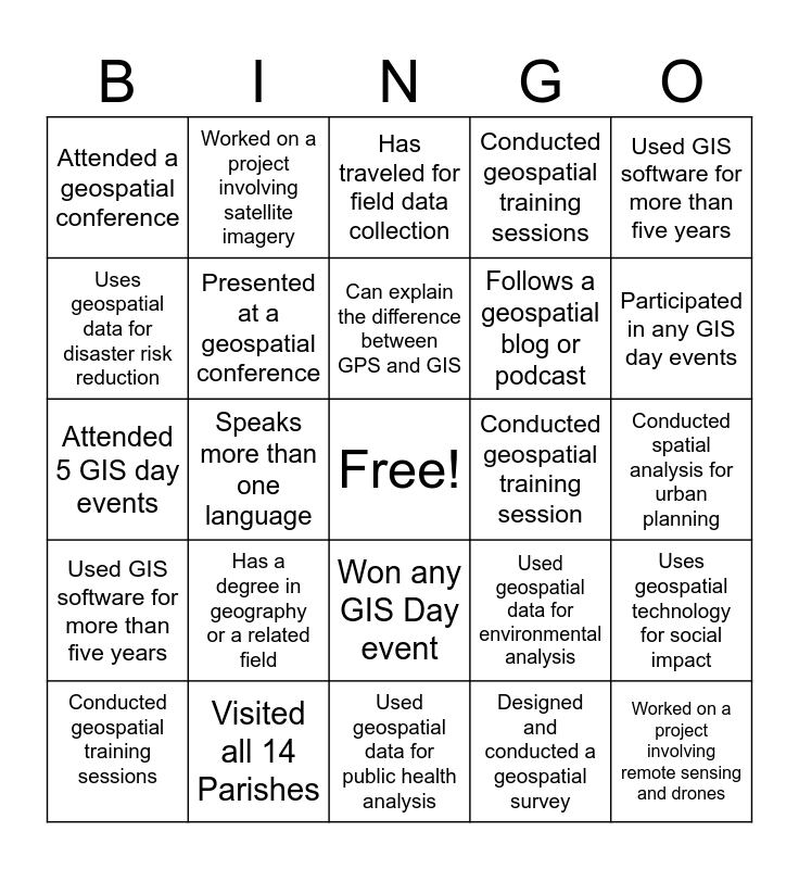 This bingo card has a free space and 33 words: Completed a geospatial certification program, Visit more than three continents, Speaks more than one language, Can name all GNSS systems, Used GIS software for more than five years, Presented at a geospatial conference, Used GIS software for more than five years, Conducted geospatial training sessions, Worked on a project involving satellite imagery, Has experience with 3D mapping, Can explain the difference between GPS and GIS, Has traveled for field data collection, Published a geospatial-related article or paper, Knows how to use a GPS device, Conducted geospatial training session, Participated in any GIS day events, Visited all 14 Parishes, Attended 5 GIS day events, Has a degree in geography or a related field, Used geospatial data for environmental analysis, Won any GIS Day event, Has a favorite mapping software/tool, Attended a geospatial conference, Conducted spatial analysis for urban planning, Used geospatial data for public health analysis, Worked on a project involving remote sensing and drones, Conducted geospatial training sessions, Follows a geospatial blog or podcast, Uses geospatial data for disaster risk reduction, Uses geospatial technology for social impact, Can name three famous geographers, Designed and conducted a geospatial survey and Won any GIS Day event.