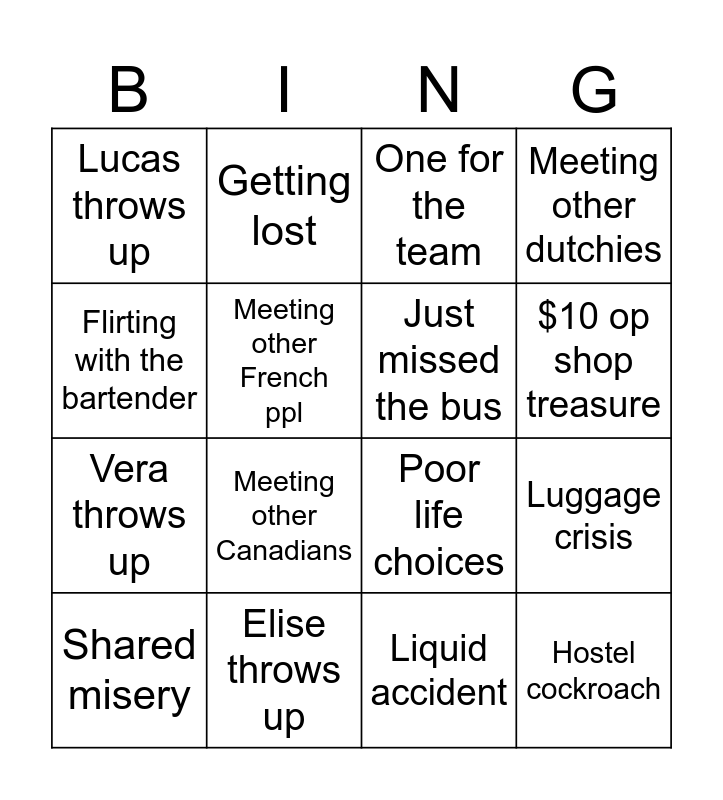 This bingo card has 16 words: Elise throws up, Luggage crisis, One for the team, Lucas throws up, Vera throws up, Getting lost, Poor life choices, Liquid accident, Flirting with the bartender, Meeting other French ppl, Shared misery, Meeting other dutchies, Meeting other Canadians, $10 op shop treasure, Just missed the bus and Hostel cockroach.