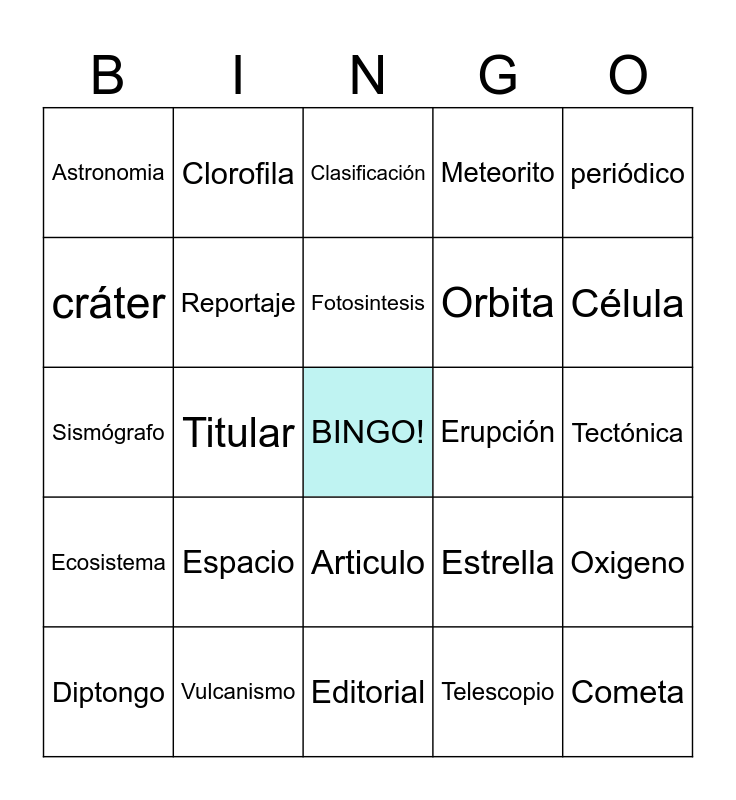 This bingo card has a free space and 24 words: Espacio, Vulcanismo, Fotosintesis, Diptongo, periódico, Astronomia, cráter, Clorofila, Erupción, Articulo, Orbita, Sismógrafo, Estrella, Oxigeno, Reportaje, Telescopio, Tectónica, Clasificación, Célula, Titular, Cometa, Ecosistema, Meteorito and Editorial.