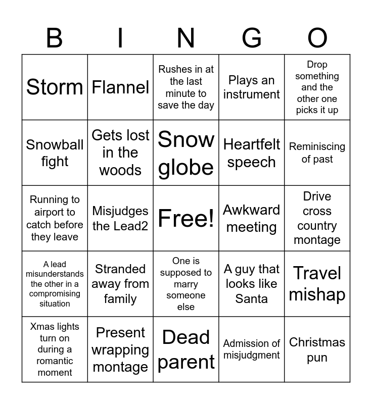 This bingo card has a free space and 46 words: Big city girl goes to a small town, Christmas pun, Caroling, Dead parent, Stranded away from family, Fireplace, Flannel, Make Xmas cookies, Snowball fight, Horses, Gets lost in the woods, Plays an instrument, Travel mishap, A guy that looks like Santa, Cabin in the woods, Struggling family business, Snow globe, Awkward meeting, The Almost Kiss, Drop something and the other one picks it up, Misjudges the Lead2, Admission of misjudgment, Storm, Heartfelt speech, Quotes the other person, Reminiscing of past, Xmas lights turn on during a romantic moment, Flirty coaching on sport/ reaching around (archery, golf), One is supposed to marry someone else, A lead misunderstands the other in a compromising situation, Caught in the act by another party(not nec dirty), Quirky friend plays Cupid, Dramatic “I’m Sorry” when they disappoint the other, Makeover, Christmas song montage, Present wrapping montage, Drive cross country montage, A Scrooge gets their Xmas spirit back, Gets trapped in a series of lies, Interrupted confession, Secret revealed by someone else, Rushes in at the last minute to save the day, Running to airport to catch before they leave, Running through rain/snow, Person professes their love in the snow/rain and Kiss in the snow.