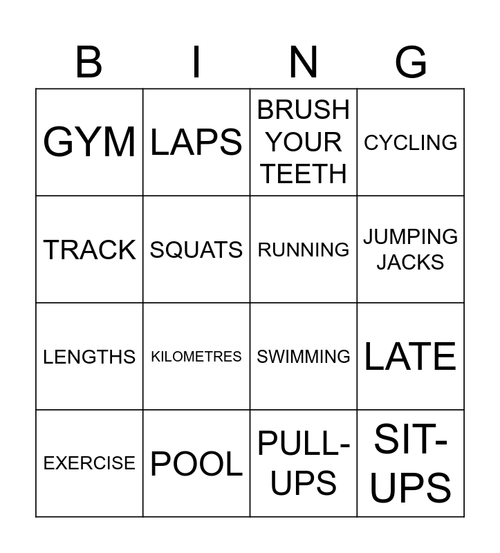 This bingo card has 20 words: LATE, EARLY, BRUSH YOUR TEETH, HEALTHY FOOD, EXERCISE, TRACK, POOL, GYM, LENGTHS, LAPS, KILOMETRES, SWIMMING, SQUATS, SIT-UPS, RUNNING, PUSH-UPS, JUMPING JACKS, CYCLING, PULL-UPS and CRUNCHES.