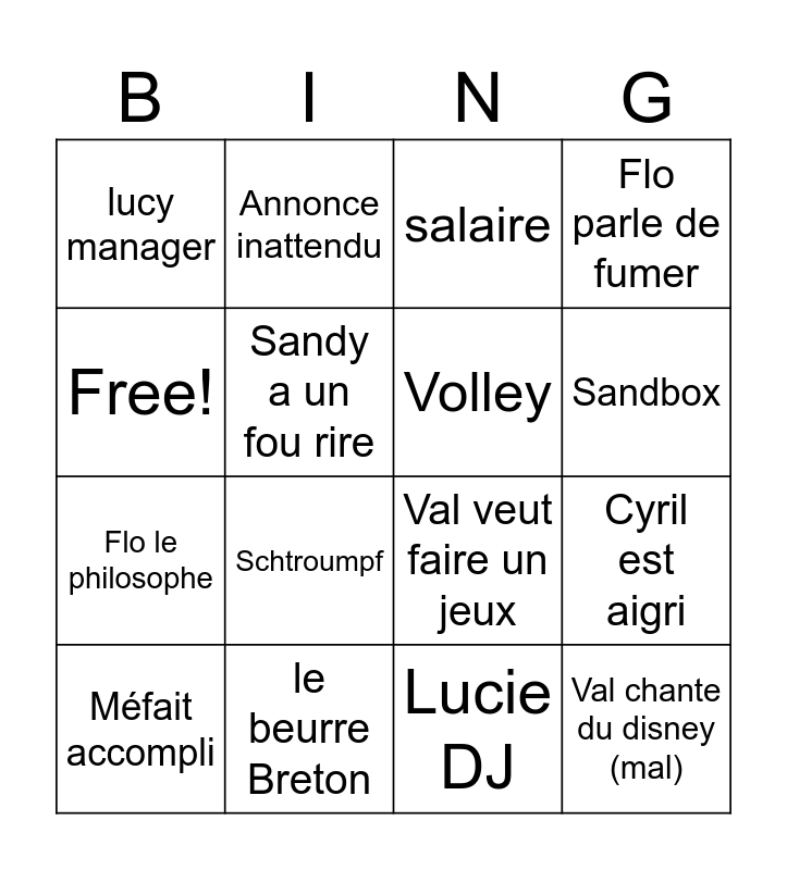 This bingo card has 16 words: le beurre Breton, Cyril est aigri, salaire, lucy manager, Flo le philosophe, Annonce inattendu, Val veut faire un jeux, Lucie DJ, Free!, Sandy a un fou rire, Méfait accompli, Flo parle de fumer, Schtroumpf, Sandbox, Volley and Val chante du disney (mal).
