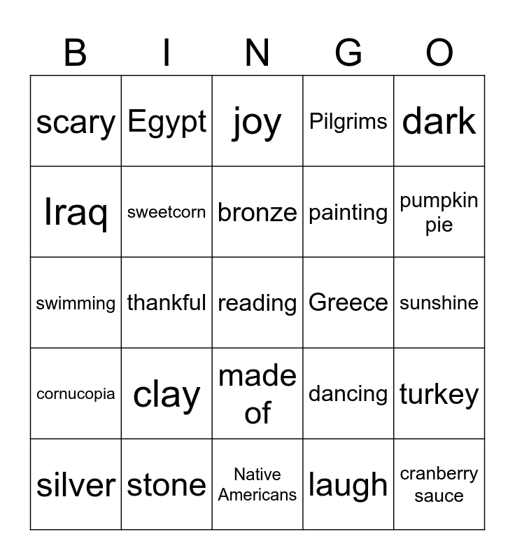 This bingo card has a free space and 24 words: clay, stone, bronze, silver, dark, scary, Iraq, Egypt, Greece, made of, painting, swimming, dancing, turkey, sweetcorn, laugh, sunshine, joy, pumpkin pie, thankful, cranberry sauce, cornucopia, Pilgrims and Native Americans.