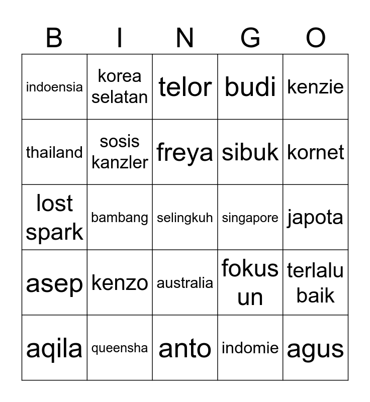 This bingo card has a free space and 24 words: kenzo, queensha, freya, aqila, kenzie, indoensia, thailand, korea selatan, singapore, australia, sibuk, lost spark, fokus un, terlalu baik, sosis kanzler, indomie, japota, telor, kornet, bambang, agus, asep, budi and anto.