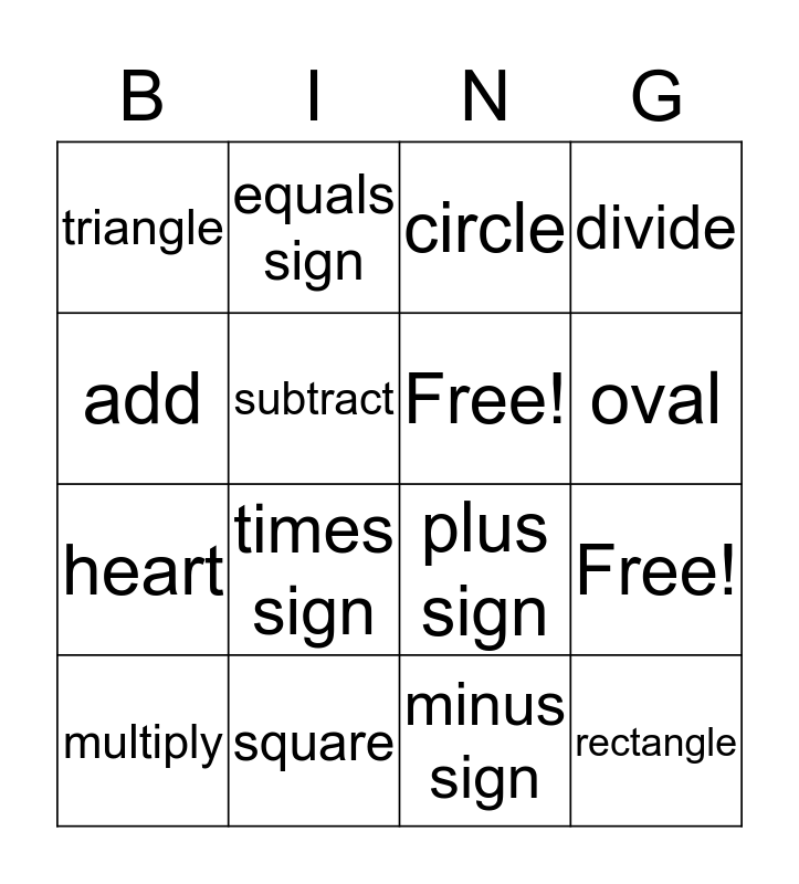 This bingo card has 16 words: square, Free!, circle, triangle, heart, equals sign, plus sign, minus sign, add, subtract, multiply, divide, times sign, oval, Free! and rectangle.