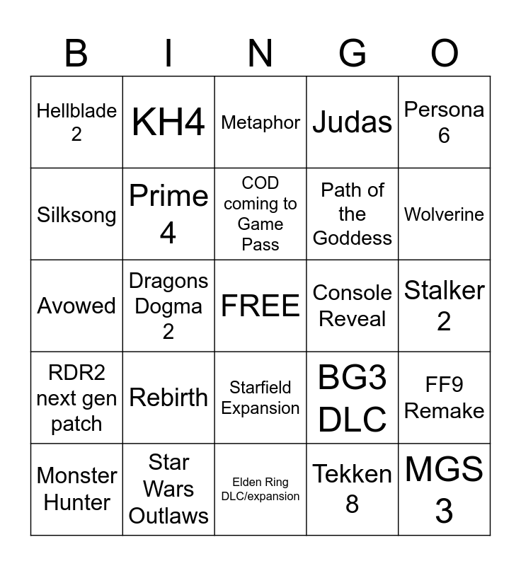 This bingo card has a free space and 24 words: Rebirth, Star Wars Outlaws, COD coming to Game Pass, Monster Hunter, Persona 6, Hellblade 2, Silksong, KH4, Console Reveal, Starfield Expansion, Path of the Goddess, Avowed, BG3 DLC, FF9 Remake, Prime 4, Tekken 8, Stalker 2, Metaphor, Wolverine, Dragons Dogma 2, MGS 3, RDR2 next gen patch, Judas and Elden Ring DLC/expansion.