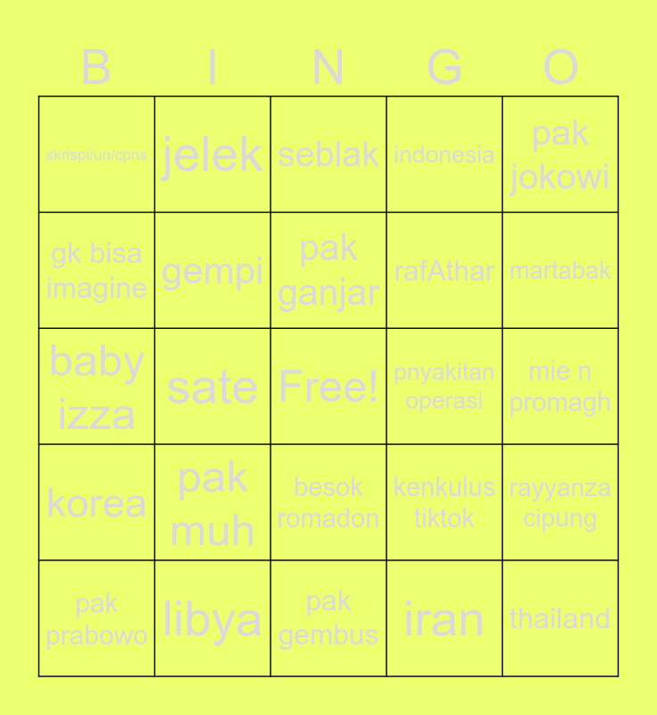 This bingo card has a free space and 25 words: pak muh, pak gembus, pak ganjar, pak prabowo, pak jokowi, skrispi/un/cpns, gk bisa imagine, jelek, pnyakitan operasi, besok romadon, rafAthar, baby izza, kenkulus tiktok, rayyanza cipung, gempi, ayam geprek, mie n promagh, seblak, martabak, sate, thailand, libya, korea, indonesia and iran.