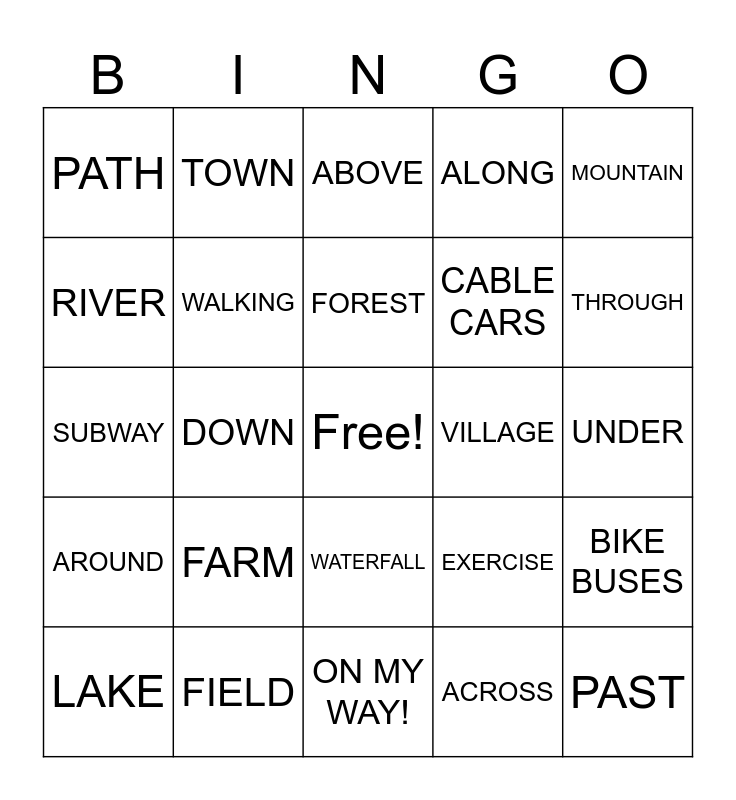 This bingo card has a free space and 24 words: FARM, FIELD, FOREST, LAKE, MOUNTAIN, PATH, RIVER, TOWN, VILLAGE, WATERFALL, CABLE CARS, SUBWAY, EXERCISE, BIKE BUSES, WALKING, ACROSS, UNDER, ABOVE, THROUGH, DOWN, PAST, AROUND, ALONG and ON MY WAY!.