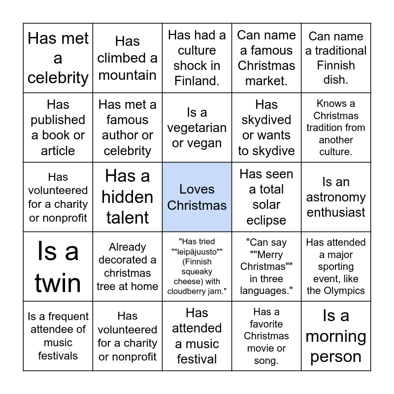 This bingo card has a free space and 106 words: Has experienced a Finnish sauna., "Has a ""sisu"" (sisukas)", Can name a traditional Finnish dish., Has seen the Northern Lights., Knows at least three Finnish cities., Can name a Finnish band or musician., Has visited at least one Finnish island., Can cross-country ski, Has tried ice swimming in Finland., Familiar with a Finnish fairytale or folklore., Can introduce yourself in Finnish, Can greet in Finnish, Came to Finland during November., Likes to eat salmiakki., "Knows what ""kalsarikännit"" means.", Has celebrated Juhannus in Finland., Has had a culture shock in Finland., Has been to a Finnish public sauna with locals., "Can tell a story about experiencing Finnish ""sisu.""", Knows how to navigate Finnish public transportation., "Has tried ""leipäjuusto"" (Finnish squeaky cheese) with cloudberry jam.", Has a story about adapting to the Finnish lifestyle or customs., Has learned a Finnish song., Can name a Finnish author or book., Experienced Juhannusta, Already decorated a christmas tree at home, Knows a Christmas tradition from another culture., Can name a famous Christmas market., Has baked traditional Christmas cookies., Has celebrated Christmas in another country., "Can say ""Merry Christmas"" in three languages.", Has a favorite Christmas movie or song., Can name a Santa's reindeer., Has made a gingerbread house., Has a pet, Speaks more than three languages, Plays a musical instrument, Has run a marathon or half-marathon, Is a vegetarian or vegan, Has lived in more than three different cities, Has climbed a mountain, Has a black belt in a martial art, Has worked in more than one country, Is a twin, Can juggle, Has published a book or article, Is a certified scuba diver, Has met a celebrity, Has a birthday in the same month as yours, Is a morning person, Has skydived or wants to skydive, Has volunteered for a charity or nonprofit, Has a hidden talent, Has traveled to more than five countries, Speaks more than two languages, Plays a musical instrument, Has run a marathon or half-marathon, Is a vegetarian or vegan, Has lived in more than three different cities, Has climbed a mountain, Has a black belt in a martial art, Has worked in more than one country, Has a twin or is a twin, Can juggle, Is a certified scuba diver, Has met a celebrity, Has a birthday in the same month as yours, Is a morning person, Has skydived or wants to skydive, Has volunteered for a charity or nonprofit, Has a hidden talent, Has attended a music festival, Is a regular blood donor, Has ridden in a hot air balloon, Likes to play chess player, Sings in a choir, Has a collection of something unusual, Has seen the Northern Lights, Has completed a DIYproject, Likes baking, Likes gardening, Is a licensed pilot or has flown a plane, Has a unique phobia or fear, Is a film buff and has seen over 100 movies in theaters, Has a talent for drawing or painting, Has participated in a protest or rally, Has seen a total solar eclipse, Is a member of a sports team or club, Has been on a TV game show, Is a good cook and loves trying new recipes, Has a famous relative or ancestor, Has completed a long-distance cycling trip, Is a regular blood donor, Has completed a marathon or triathlon, Is a certified yoga instructor, Has attended a major sporting event, like the Olympics, Is a published poet or writer, Is a skilled dancer in a specific style, Is a member of a choir or singing group, Is an astronomy enthusiast, Has met a famous author or celebrity, Has a unique talent, like fire juggling or acrobatics, Has a patent for an invention, Has participated in a scientific research project, Is a frequent attendee of music festivals and Has completed a long-distance cycling trip.