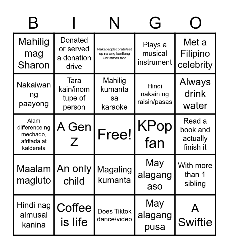This bingo card has a free space and 24 words: An only child, Coffee is life, Mahilig kumanta sa karaoke, Hindi nag almusal kanina, Met a Filipino celebrity, Mahilig mag Sharon, Nakaiwan ng paayong, Donated or served a donation drive, KPop fan, Magaling kumanta, Hindi nakain ng raisin/pasas, Alam difference ng mechado, afritada at kaldereta, May alagang aso, With more than 1 sibling, Tara kain/inom tupe of person, May alagang pusa, Read a book and actually finish it, Nakapagdecorate/set up na ang kanilang Christmas tree, Always drink water, A Gen Z, A Swiftie, Maalam magluto, Plays a musical instrument and Does Tiktok dance/video.
