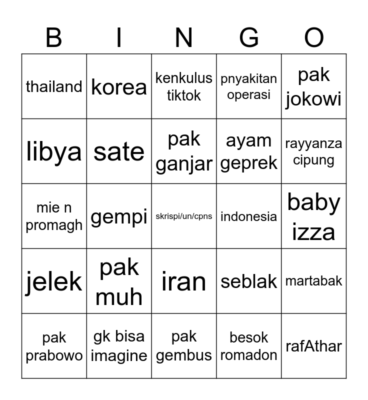 This bingo card has 25 words: pak muh, pak gembus, pak ganjar, pak prabowo, pak jokowi, thailand, libya, korea, indonesia, iran, ayam geprek, mie n promagh, seblak, martabak, sate, rafAthar, baby izza, kenkulus tiktok, rayyanza cipung, gempi, skrispi/un/cpns, gk bisa imagine, jelek, pnyakitan operasi and besok romadon.