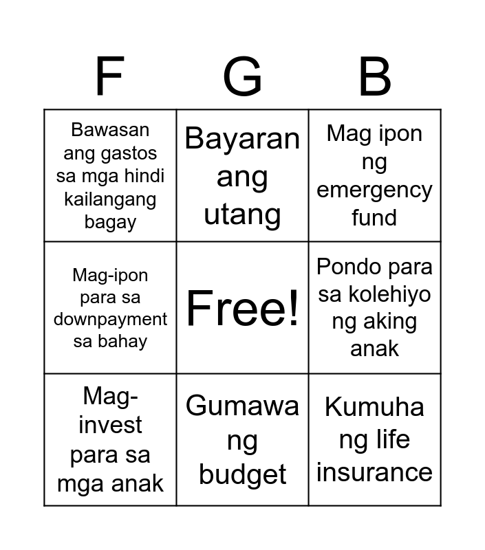 This bingo card has a free space and 8 words: Mag-ipon para sa downpayment sa bahay, Bayaran ang utang, Pondo para sa kolehiyo ng aking anak, Mag-invest para sa mga anak, Mag ipon ng emergency fund, Bawasan ang gastos sa mga hindi kailangang bagay, Gumawa ng budget and Kumuha ng life insurance.