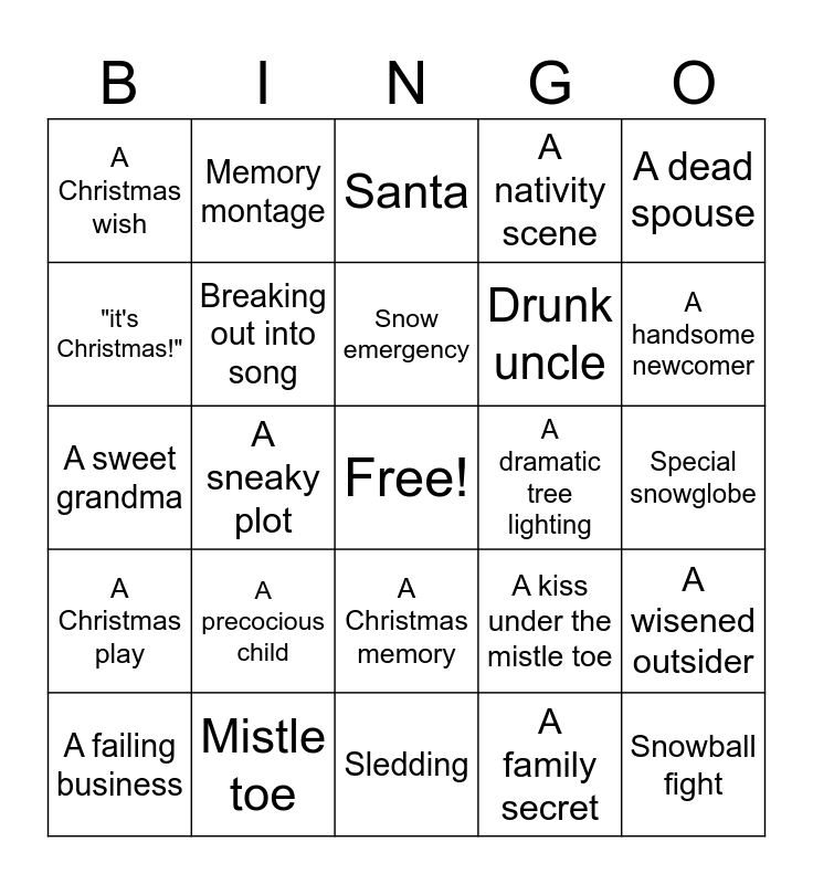 This bingo card has a free space and 24 words: A precocious child, Mistle toe, Snow emergency, A failing business, A dead spouse, A Christmas wish, "it's Christmas!", Memory montage, A dramatic tree lighting, A Christmas memory, Drunk uncle, A sweet grandma, A kiss under the mistle toe, A wisened outsider, Breaking out into song, A family secret, Special snowglobe, Santa, A handsome newcomer, A sneaky plot, Snowball fight, A Christmas play, A nativity scene and Sledding.
