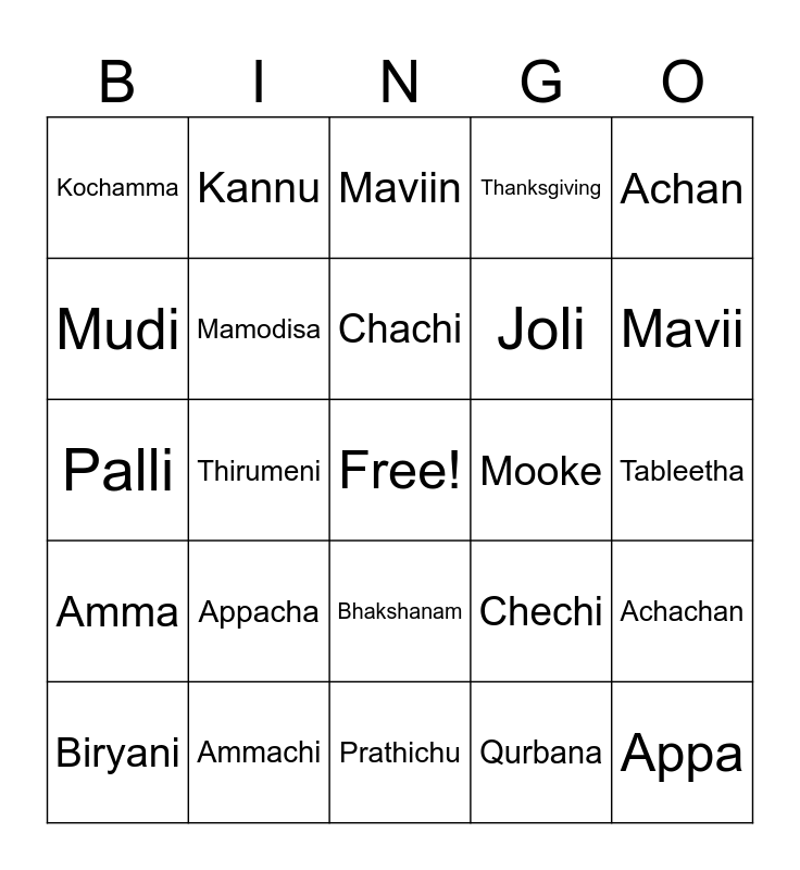 This bingo card has a free space and 24 words: Appacha, Ammachi, Chachi, Biryani, Achan, Kochamma, Mudi, Kannu, Mooke, Bhakshanam, Joli, Palli, Chechi, Achachan, Mamodisa, Qurbana, Tableetha, Maviin, Mavii, Thirumeni, Appa, Amma, Thanksgiving and Prathichu.
