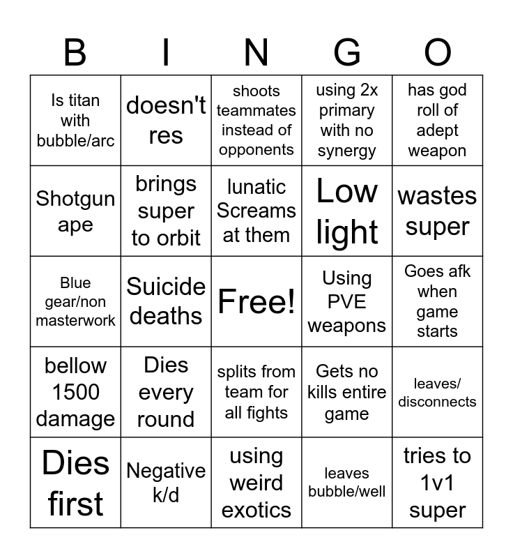 This bingo card has a free space and 24 words: Dies every round, Negative k/d, lunatic Screams at them, Dies first, has god roll of adept weapon, Is titan with bubble/arc, Shotgun ape, doesn't res, Using PVE weapons, splits from team for all fights, Low light, Blue gear/non masterwork, Gets no kills entire game, leaves/ disconnects, brings super to orbit, leaves bubble/well, Goes afk when game starts, shoots teammates instead of opponents, wastes super, Suicide deaths, tries to 1v1 super, bellow 1500 damage, using 2x primary with no synergy and using weird exotics.