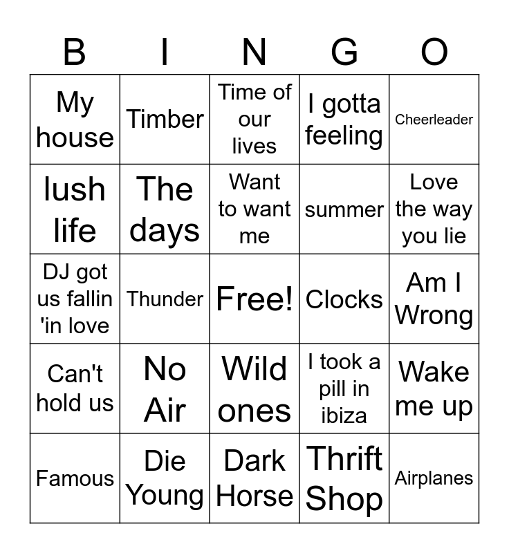This bingo card has a free space and 29 words: Famous, New Rules, Thunder, One dance, My house, Time of our lives, The days, No Air, Clocks, Die Young, Am I Wrong, Airplanes, Dark Horse, Thrift Shop, Love the way you lie, Replay, Wild ones, Can't hold us, Cheerleader, DJ got us fallin 'in love, I took a pill in ibiza, cheap thrills, summer, lush life, I gotta feeling, Timber, Wake me up, Want to want me and Scream & Shout.
