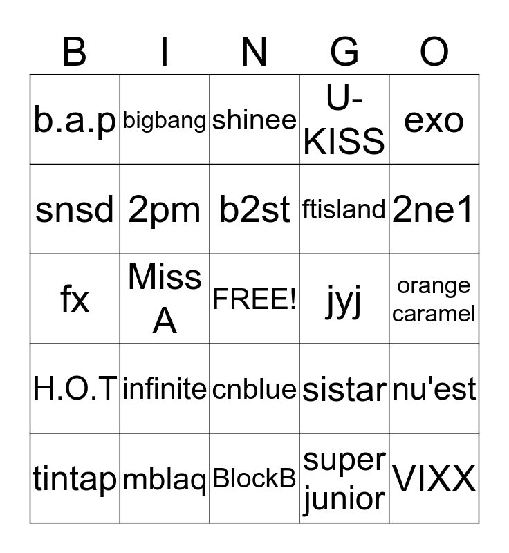 This bingo card has a free space and 24 words: infinite, mblaq, b2st, tintap, exo, b.a.p, snsd, bigbang, jyj, cnblue, ftisland, fx, sistar, nu'est, 2pm, super junior, orange caramel, shinee, 2ne1, Miss A, VIXX, H.O.T, U-KISS and BlockB.