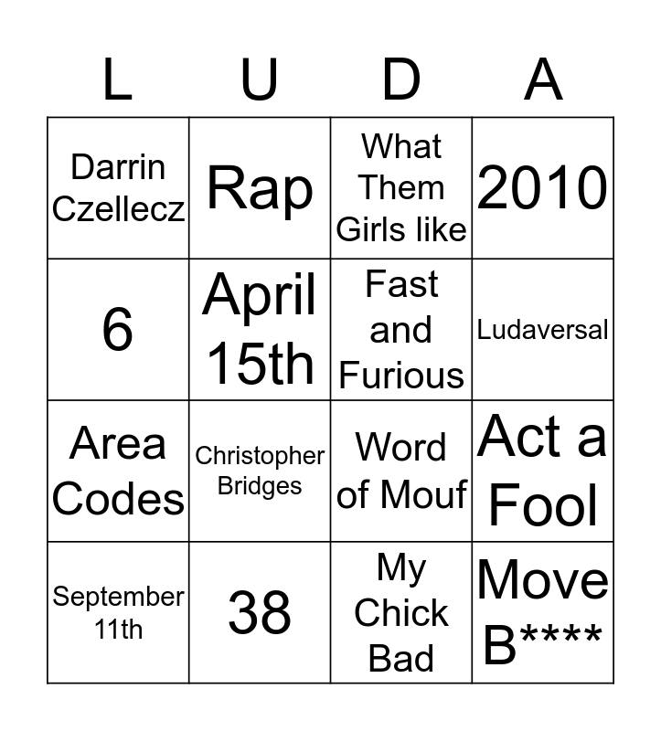 This bingo card has a free space and 15 words: September 11th, Move B****, What Them Girls like, Darrin Czellecz, Ludaversal, 6, Christopher Bridges, My Chick Bad, April 15th, Area Codes, Act a Fool, 2010, Fast and Furious, Rap and 38.