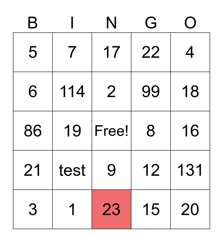 This bingo card has a free space and 24 words: test, 1, 2, 3, 4, 5, 6, 7, 8, 9, 99, 86, 12, 131, 114, 15, 16, 17, 18, 19, 20, 21, 22 and 23.