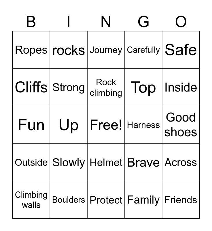 This bingo card has a free space and 24 words: Slowly, Boulders, Rock climbing, Climbing walls, Safe, Ropes, Cliffs, rocks, Harness, Helmet, Top, Fun, Brave, Across, Strong, Family, Good shoes, Journey, Inside, Up, Friends, Outside, Carefully and Protect.