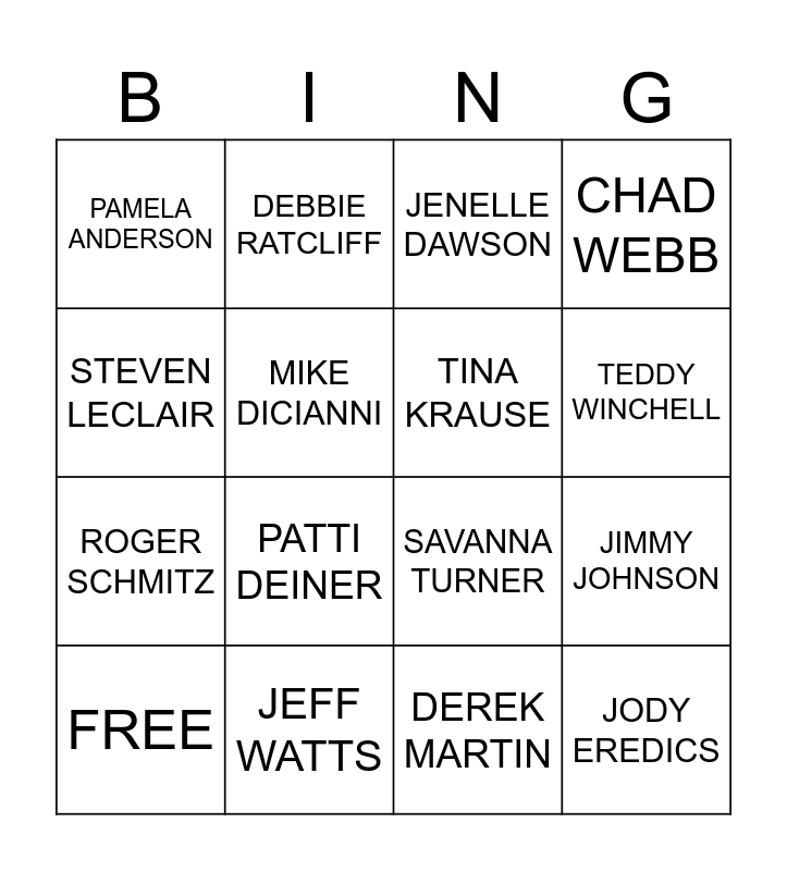 This bingo card has 16 words: JEFF WATTS, JIMMY JOHNSON, JENELLE DAWSON, PAMELA ANDERSON, ROGER SCHMITZ, DEBBIE RATCLIFF, SAVANNA TURNER, DEREK MARTIN, STEVEN LECLAIR, MIKE DICIANNI, FREE, CHAD WEBB, PATTI DEINER, TEDDY WINCHELL, TINA KRAUSE and JODY EREDICS.