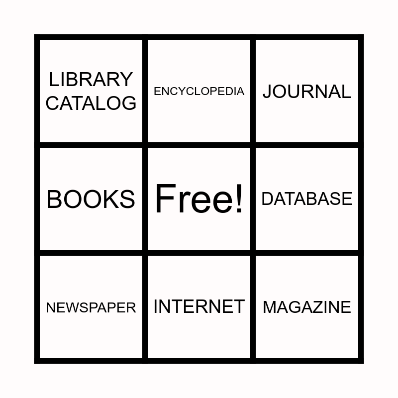This bingo card has a free space and 8 words: BOOKS, ENCYCLOPEDIA, DATABASE, NEWSPAPER, JOURNAL, LIBRARY CATALOG, INTERNET and MAGAZINE.
