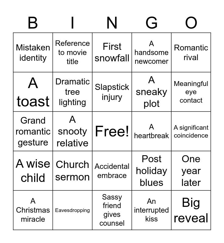 This bingo card has a free space and 24 words: Church sermon, Eavesdropping, Slapstick injury, A Christmas miracle, Romantic rival, Mistaken identity, A toast, Reference to movie title, A heartbreak, Accidental embrace, A sneaky plot, Grand romantic gesture, Post holiday blues, One year later, Dramatic tree lighting, An interrupted kiss, A significant coincidence, First snowfall, Meaningful eye contact, A snooty relative, Big reveal, A wise child, A handsome newcomer and Sassy friend gives counsel.