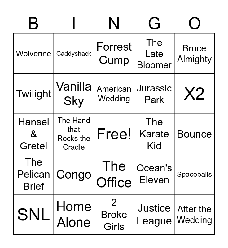 This bingo card has a free space and 64 words: Gollum, The Matrix Resurrections, Silence of the Lambs, Spaceballs, Throw Mama from the Train, Pitch Perfect, Caddyshack, Hulk, American Wedding, Shazam!, The Office, Natural Selection, Bounce, Bruce Almighty, Catch Me If You Can, Twilight, The Hand that Rocks the Cradle, Wolverine, Austin Powers, Jurassic Park, Congo, The Pelican Brief, The Late Bloomer, Sling Blade, Minority Report, The Untouchables, Gods of Egypt, Piranha 3D, Sherlock Holmes, Crocodile Dundee II, Batman, Coming to America, Body Heat, Contact, X2, SNL, Elektra, Justice League, Scrooged, Vanilla Sky, Hansel & Gretel, The Karate Kid, Last Vegas, The Hunt for Red October, Rain Man, After the Wedding, Home Alone, The River Wild, Ocean's Eleven, Happy Gilmore, Goodfellas, Blow, 2 Broke Girls, Fire Down Below, Pushing Tin, The Italian Job, Forrest Gump, Premonition, Inception, Grown Ups, Major League, The Time Machine, The Great Gatsby and Ozark.