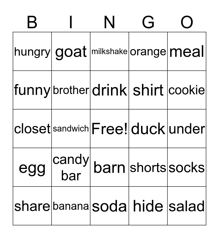 This bingo card has a free space and 24 words: candy bar, banana, drink, share, meal, hungry, funny, goat, duck, barn, shirt, closet, shorts, socks, brother, hide, under, milkshake, cookie, sandwich, salad, egg, orange and soda.