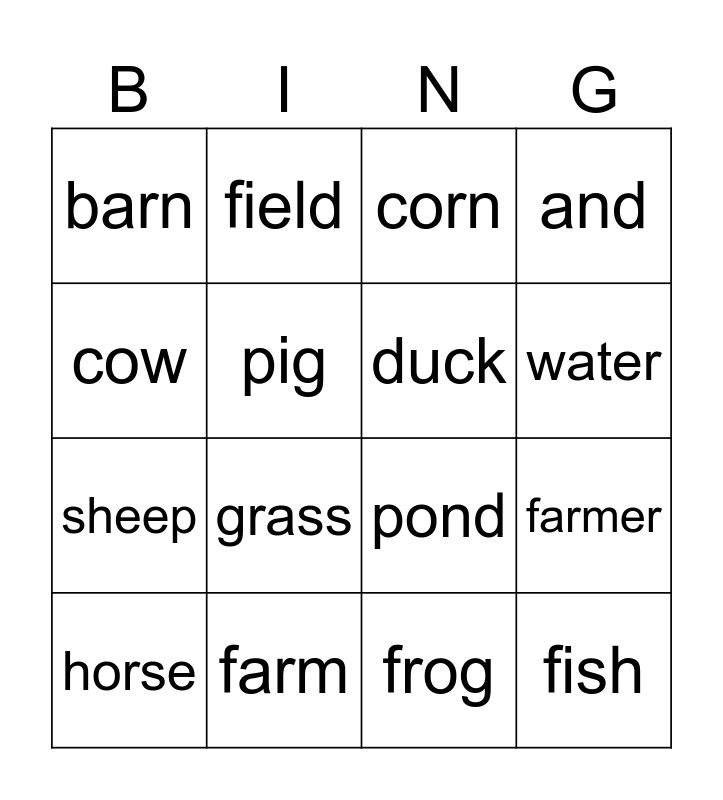 This bingo card has 16 words: farm, farmer, corn, barn, sheep, field, pond, frog, cow, pig, horse, and, grass, water, duck and fish.