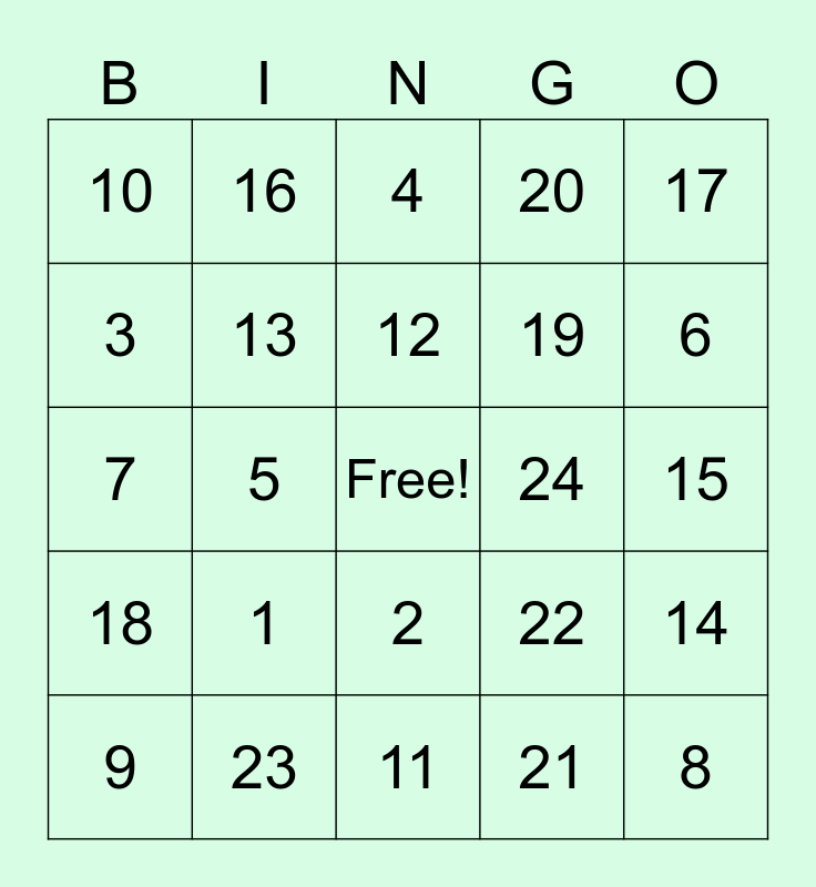 This bingo card has a free space and 24 words: 1, 23, 12, 9, 17, 10, 3, 16, 24, 2, 19, 7, 22, 14, 13, 21, 15, 4, 6, 5, 8, 18, 20 and 11.
