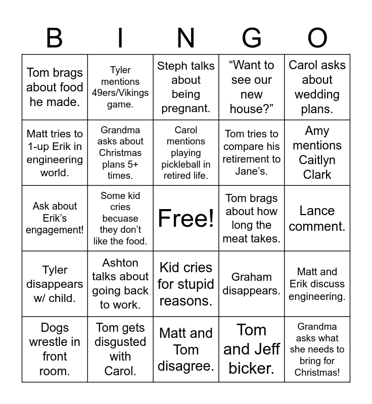 This bingo card has a free space and 25 words: Tyler disappears w/ child., Tom gets disgusted with Carol., Matt and Tom disagree., Tom and Jeff bicker., Carol asks about wedding plans., Tom brags about food he made., Tyler mentions 49ers/Vikings game., Steph talks about being pregnant., Tom brags about how long the meat takes., Matt and Erik discuss engineering., Matt tries to 1-up Erik in engineering world., Grandma asks about Christmas plans 5+ times., Grayson or Graham hit someone., Graham disappears., Amy mentions Caitlyn Clark, Dogs wrestle in front room., Some kid cries becuase they don’t like the food., Carol mentions playing pickleball in retired life., Tom tries to compare his retirement to Jane’s., Lance comment., Ask about Erik’s engagement!, Ashton talks about going back to work., Kid cries for stupid reasons., “Want to see our new house?” and Grandma asks what she needs to bring for Christmas!.