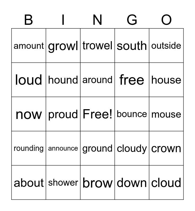 This bingo card has a free space and 39 words: sound, scout, mouth, hound, about, ground, around, amount, outside, rounding, proud, south, cloud, mouse, bounce, announce, shouted, amount, underground, cloudy, loud, brow, free, house, count, clown, howl, flower, town, growl, browse, vowel, trowel, shower, down, towel, crown, now and eyebrow.
