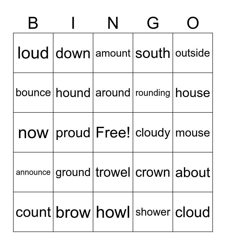 This bingo card has a free space and 38 words: sound, scout, mouth, hound, about, ground, around, amount, outside, rounding, proud, south, cloud, mouse, bounce, announce, shouted, amount, underground, cloudy, loud, brow, house, count, clown, howl, flower, town, growl, browse, vowel, trowel, shower, down, towel, crown, now and eyebrow.