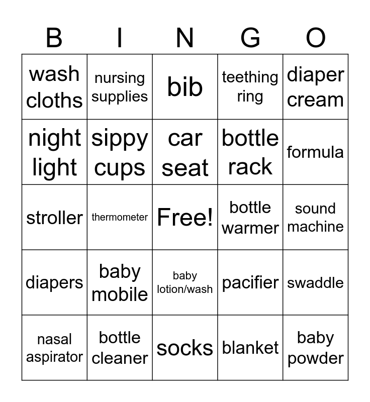 This bingo card has a free space and 24 words: baby mobile, bottle cleaner, car seat, nasal aspirator, diaper cream, wash cloths, night light, nursing supplies, bottle warmer, baby lotion/wash, bottle rack, stroller, pacifier, swaddle, sippy cups, blanket, sound machine, bib, formula, thermometer, baby powder, diapers, teething ring and socks.