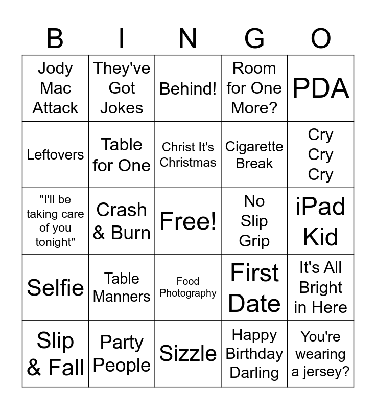 This bingo card has a free space and 24 words: Table Manners, Party People, Christ It's Christmas, Slip & Fall, PDA, Jody Mac Attack, Leftovers, They've Got Jokes, No Slip Grip, Food Photography, Cigarette Break, "I'll be taking care of you tonight", First Date, It's All Bright in Here, Table for One, Happy Birthday Darling, iPad Kid, Behind!, Cry Cry Cry, Crash & Burn, You're wearing a jersey?, Selfie, Room for One More? and Sizzle.
