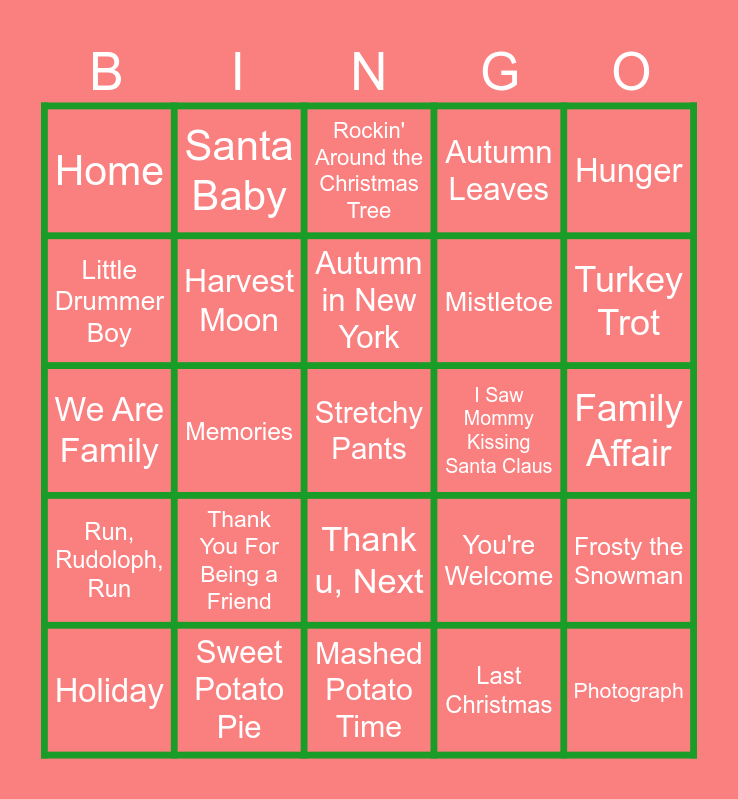 This bingo card has a free space and 28 words: Frosty the Snowman, Rudolph the Rednosed Reindeer, Mistletoe, Last Christmas, Little Drummer Boy, Rockin' Around the Christmas Tree, Santa Baby, Run, Rudoloph, Run, I Saw Mommy Kissing Santa Claus, Holiday, We Are Family, Autumn Leaves, Sweet Potato Pie, Mashed Potato Time, Turkey Trot, Celebration, Thank You For Being a Friend, Harvest Moon, Autumn in New York, Thank u, Next, Home, Over the River and Through the Woods, Photograph, Memories, Family Affair, You're Welcome, Hunger and Blessings.