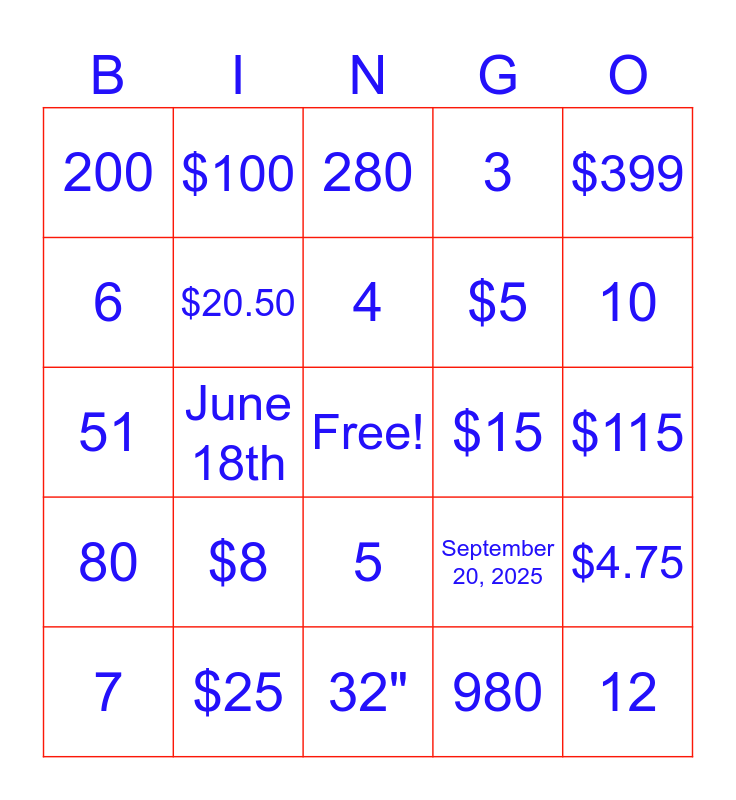 This bingo card has a free space and 24 words: $8, $25, 4, 7, $399, 200, 6, $100, $15, 5, $5, 51, September 20, 2025, $4.75, $20.50, 980, $115, 280, 10, June 18th, 12, 80, 3 and 32".