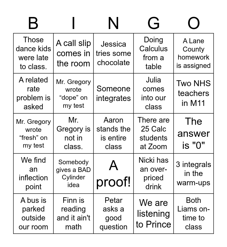 This bingo card has 63 words: Free!, Mr. Gregory says "differential", Super 6 in The Cylinder, 3 integrals in the warm-ups, Newton, yes., "midpoint" is spoken, A call slip comes in the room, Bernhard Riemann is referenced, Someone integrates, I see rectangles, A proof!, Mr. Gregory wears a sweater, The answer is "0", A Lane County homework is assigned, I see 2 Calculus books in the room., A related rate problem is asked, Mr. Gregory is not in class., Those dance kids were late to class., A physics problem, Julia comes into our class, Somebody gives a BAD Cylinder idea, We find an inflection point, Doing Calculus from a table, We are listening to Taylor Swift, We are listening to Chris Stapleton, More than 4 people are absent, That is an absolute max!, Our exam is this week., We got 4 of the 5 songs in Jeopardy!, We are doing a graph reading problem, The answer is "undefined", The answer is "1", I see a parabola, 20 classmates here before class starts, Two NHS teachers in M11, A bus is parked outside our room, Mr. Gregory wears a tie, We are listening to Prince, We are listening to the Beatles, Mr. Gregory wrote “dope” on my test, Mr. Gregory wrote “fresh” on my test, There are 25 Calc students at Zoom, “A” on the home test 4 U, Hit-the Deck! Winning success under 10 sec, Aaron stands the is entire class, Finn is reading and it ain't math, Both Liams on-time to class, Nicki has an over-priced drink, Ariatna does an integral correctly, Ella answers 2 questions in one class, The Table of 6 is just 5 today, Petar asks a good question, Sebastian compliments Yovani publicly, Morgan wears a hip hat, Jean-Luc asks 2 questions about HW, Jessica tries some chocolate, A person that dropped is in class today!, Harrison & Aura both ask questions, Keira: first to finish the warm-ups correctly, 2 people with the same names have switched seats!, Naomi & Noah both have Spanish books, The burro tail and Olivia sit together and Luke disappoints during a game.