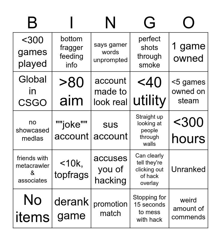 This bingo card has a free space and 24 words: <10k, topfrags, derank game, account made to look real, No items, 1 game owned, <300 games played, Global in CSGO, bottom fragger feeding info, Straight up looking at people through walls, accuses you of hacking, <40 utility, no showcased medlas, Can clearly tell they're clicking out of hack overlay, Unranked, >80 aim, Stopping for 15 seconds to mess with hack, <300 hours, says gamer words unprompted, <5 games owned on steam, ""joke"" account, weird amount of commends, friends with metacrawler & associates, perfect shots through smoke and promotion match.