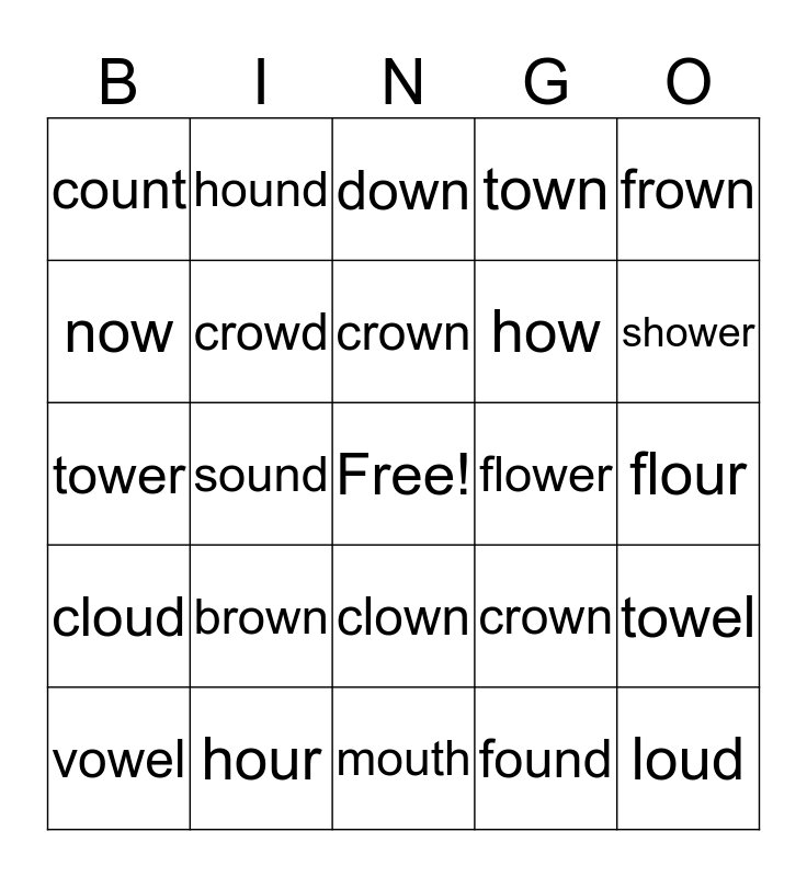 This bingo card has a free space and 33 words: ground, ouch, sound, about, cloud, crowd, frown, vowel, hound, around, crown, down, plow, shout, flower, shower, hour, tower, brown, crown, clown, couch, count, flour, mouth, loud, town, how, now, towel, house, found and out.