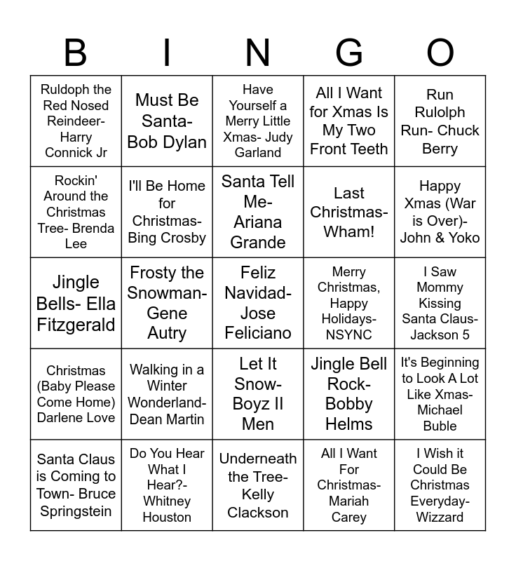 This bingo card has 25 words: Walking in a Winter Wonderland- Dean Martin, Underneath the Tree- Kelly Clackson, Santa Tell Me- Ariana Grande, Santa Claus is Coming to Town- Bruce Springstein, Run Rulolph Run- Chuck Berry, Ruldoph the Red Nosed Reindeer- Harry Connick Jr, Rockin' Around the Christmas Tree- Brenda Lee, Must Be Santa- Bob Dylan, Merry Christmas, Happy Holidays- NSYNC, Let It Snow- Boyz II Men, Last Christmas- Wham!, Jingle Bells- Ella Fitzgerald, Jingle Bell Rock- Bobby Helms, It's Beginning to Look A Lot Like Xmas- Michael Buble, I'll Be Home for Christmas- Bing Crosby, I Wish it Could Be Christmas Everyday-Wizzard, I Saw Mommy Kissing Santa Claus- Jackson 5, Have Yourself a Merry Little Xmas- Judy Garland, Happy Xmas (War is Over)- John & Yoko, Frosty the Snowman- Gene Autry, Feliz Navidad- Jose Feliciano, Do You Hear What I Hear?- Whitney Houston, Christmas (Baby Please Come Home) Darlene Love, All I Want for Xmas Is My Two Front Teeth and All I Want For Christmas- Mariah Carey.