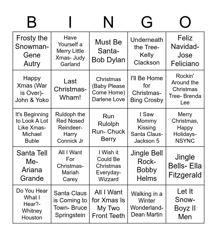 This bingo card has 25 words: All I Want For Christmas- Mariah Carey, All I Want for Xmas Is My Two Front Teeth, Christmas (Baby Please Come Home) Darlene Love, Do You Hear What I Hear?- Whitney Houston, Feliz Navidad- Jose Feliciano, Frosty the Snowman- Gene Autry, Happy Xmas (War is Over)- John & Yoko, Have Yourself a Merry Little Xmas- Judy Garland, I Saw Mommy Kissing Santa Claus- Jackson 5, I Wish it Could Be Christmas Everyday-Wizzard, I'll Be Home for Christmas- Bing Crosby, It's Beginning to Look A Lot Like Xmas- Michael Buble, Jingle Bell Rock- Bobby Helms, Jingle Bells- Ella Fitzgerald, Last Christmas- Wham!, Let It Snow- Boyz II Men, Merry Christmas, Happy Holidays- NSYNC, Must Be Santa- Bob Dylan, Rockin' Around the Christmas Tree- Brenda Lee, Ruldoph the Red Nosed Reindeer- Harry Connick Jr, Run Rulolph Run- Chuck Berry, Santa Claus is Coming to Town- Bruce Springstein, Santa Tell Me- Ariana Grande, Underneath the Tree- Kelly Clackson and Walking in a Winter Wonderland- Dean Martin.