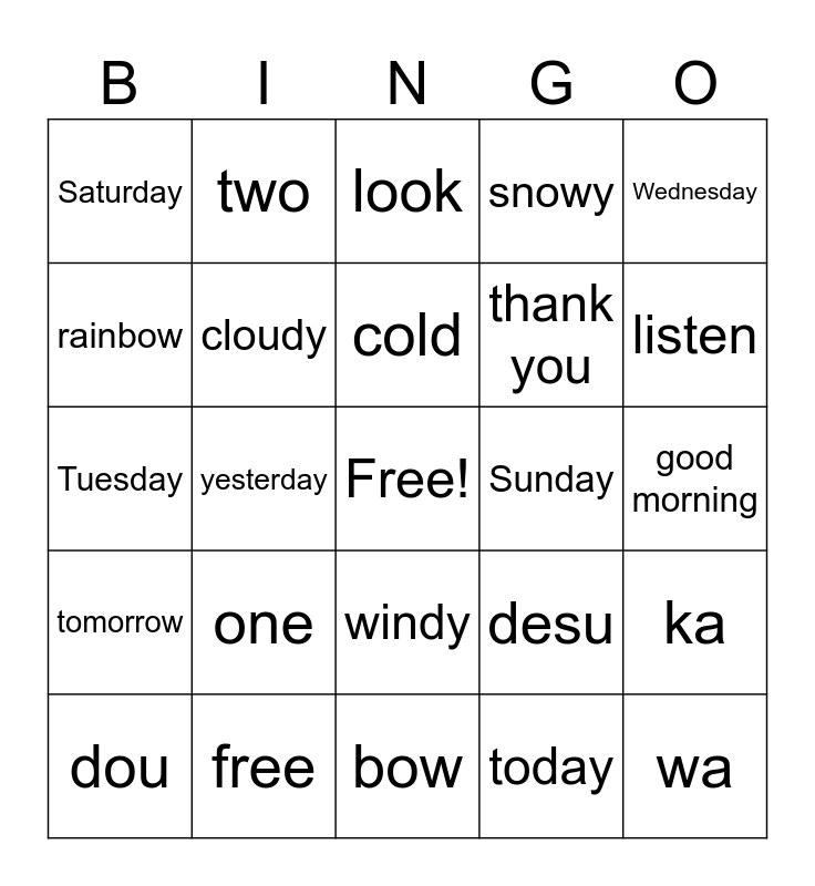This bingo card has a free space and 35 words: weather, sunny, rainy, cloudy, windy, snowy, rainbow, hot, cold, Monday, Tuesday, Wednesday, Thursday, Friday, Saturday, Sunday, today, yesterday, tomorrow, wa, desu, dou, ka, free, look, listen, be quiet, sit down, thank you, good morning, good bye, bow, one, two and three.