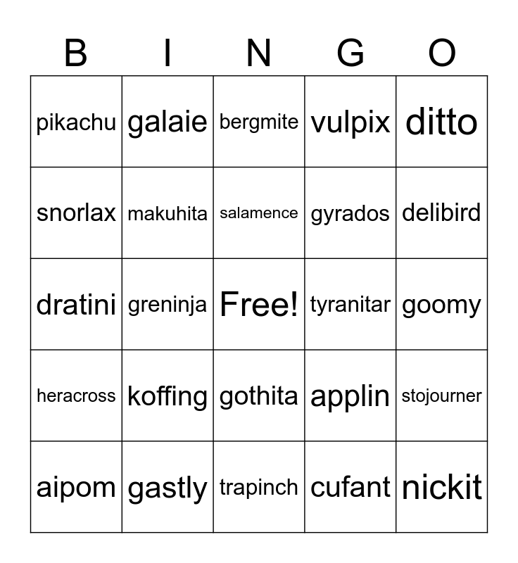 This bingo card has a free space and 29 words: aipom, charmander, greninja, bulbasaur, pikachu, bergmite, makuhita, koffing, tyranitar, gastly, goomy, nickit, trapinch, cufant, delibird, jigglypuff, gothita, heracross, ditto, dratini, applin, growlithe, gyrados, snorlax, vulpix, galaie, stojourner, salamence and ribombeee.