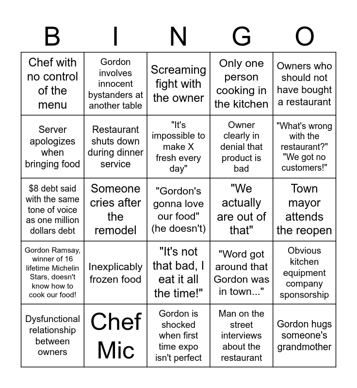 This bingo card has a free space and 24 words: Inexplicably frozen food, Chef Mic, "It's impossible to make X fresh every day", Dysfunctional relationship between owners, Owners who should not have bought a restaurant, Chef with no control of the menu, Server apologizes when bringing food, Gordon involves innocent bystanders at another table, "We actually are out of that", "It's not that bad, I eat it all the time!", Owner clearly in denial that product is bad, $8 debt said with the same tone of voice as one million dollars debt, "Word got around that Gordon was in town...", Obvious kitchen equipment company sponsorship, Restaurant shuts down during dinner service, Man on the street interviews about the restaurant, Town mayor attends the reopen, Screaming fight with the owner, "What's wrong with the restaurant?" "We got no customers!", Someone cries after the remodel, Gordon hugs someone's grandmother, Gordon Ramsay, winner of 16 lifetime Michelin Stars, doesn't know how to cook our food!, Only one person cooking in the kitchen and Gordon is shocked when first time expo isn't perfect.