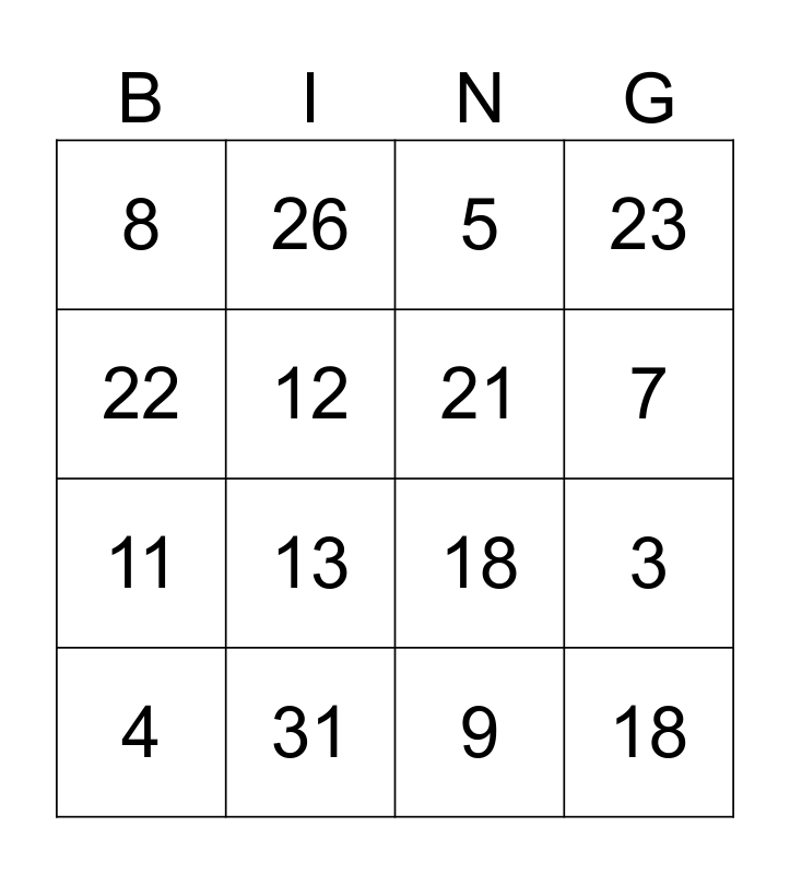 This bingo card has 16 words: 31, 3, 5, 8, 11, 26, 18, 9, 22, 12, 4, 23, 13, 7, 21 and 18.