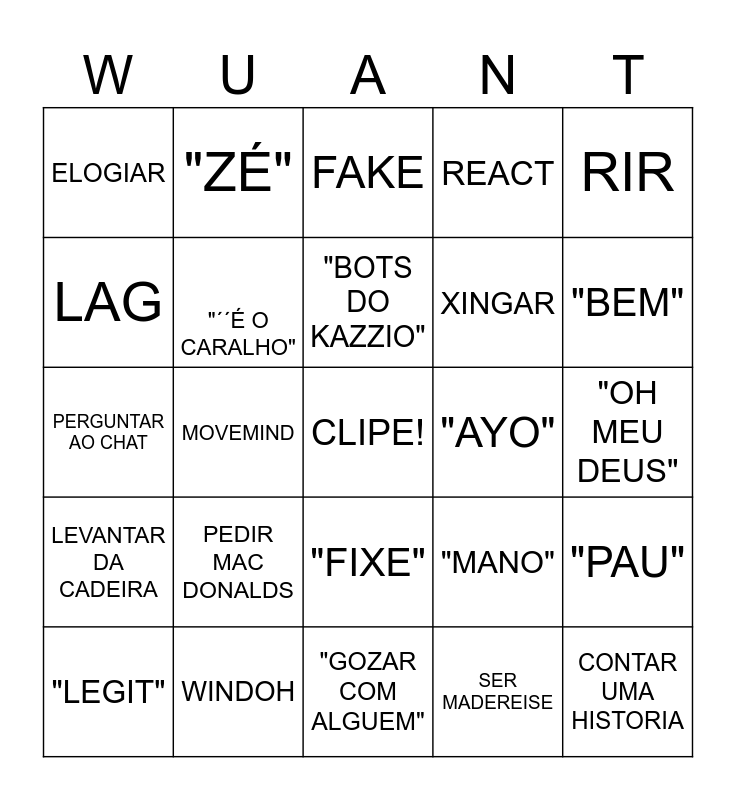 This bingo card has a free space and 64 words: "UABO", "AVEIRO", IR EMBORA DA CAMERA, SER MADEREISE, MOMENTO SUS, RAGE / FICAR BRAVO, "ZÉ", "FODA-SE", "AYO", NAO SABER JOGAR, LEVANTAR DA CADEIRA, PIADAS RUINS, "MANO", RIR, DAR BAIT, "´´É O CARALHO", "BOTS DO KAZZIO", REACT, RAID DE EMOJI, LAG, WINDOH, "FIXE", XINGAR, CONTAR UMA HISTORIA, KAZZIO, MEMES, NPC MOMENTS, ASSUNTO RANDOM, "OH MEU DEUS", "LEGIT", "FULL", "BOAS", "GEMIDO", "BORA LA", PERGUNTAR AO CHAT, "QUE MERDA", NAO ACABAR UMA FRASE, "NUNO", BLUEYES, ELOGIAR, MOVEMIND, "GOZAR COM ALGUEM", GOZAR COM O CHAT, FALAR UM YOUTUBER, DIZER ALGO DO CANAL DE CILPES, PEDIR MAC DONALDS, AGRADECER O PRIME, SER SERIO, "BEM", INTRO, "PENSEM", CHORAR, "OK", "PAU", RECLAMAR, DIZER QUE É UM GORDO, FAKE, SER SCAM, "GRANDE", "SHE", STORYTIME, CANTAR, SUSTO and FALAR SOBRE SEXO.
