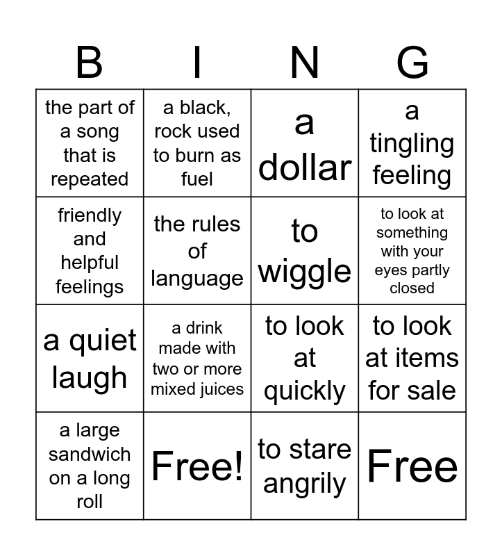 This bingo card has 16 words: Free!, to look at items for sale, a dollar, the part of a song that is repeated, a quiet laugh, a black, rock used to burn as fuel, to look at quickly, to stare angrily, friendly and helpful feelings, the rules of language, a large sandwich on a long roll, a tingling feeling, a drink made with two or more mixed juices, to look at something with your eyes partly closed, to wiggle and Free.