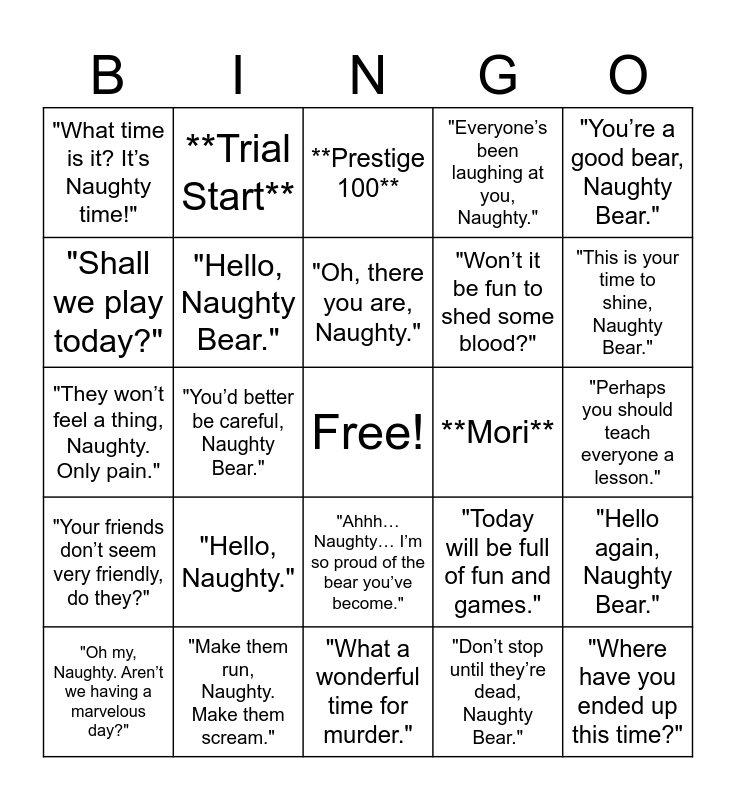 This bingo card has a free space and 37 words: **Full List of Naughty Bear Subtitles**, **Menu**, "Oh, look! It’s Naughty Bear.", "Hello, Naughty Bear.", "Hello again, Naughty Bear.", "Hello, Naughty.", "Oh, there you are, Naughty.", "Good day, Naughty.", "You’re a good bear, Naughty Bear.", "It’s a wonderful day to have fun!", "You’d better be careful, Naughty Bear.", "Everyone’s been laughing at you, Naughty.", "Where have you ended up this time?", "Perhaps you should teach everyone a lesson.", "Shall we play today?", "Your friends don’t seem very friendly, do they?", "Oh, my! Is it time for a game?", **Prestige 100**, "Ahhh… Naughty… I’m so proud of the bear you’ve become.", **Mori**, "What time is it? It’s Naughty time!", "This is your time to shine, Naughty Bear.", "Oh my, Naughty. Aren’t we having a marvelous day?", "What a wonderful time for murder.", "Now, now. What a Naughty Bear you are.", "Don’t stop until they’re dead, Naughty Bear.", **Trial Start**, "I do believe some people are going to die today.", "I wonder who’s going to die today?", "The time has come to hurt some people.", "They’re all going to pay, won’t they, Naughty?, "Make them run, Naughty. Make them scream.", "They won’t feel a thing, Naughty. Only pain.", "Who’s a good killer? You are, Naughty.", "Today will be full of fun and games.", "Won’t it be fun to shed some blood?" and "Time to do what you do best, Naughty.".